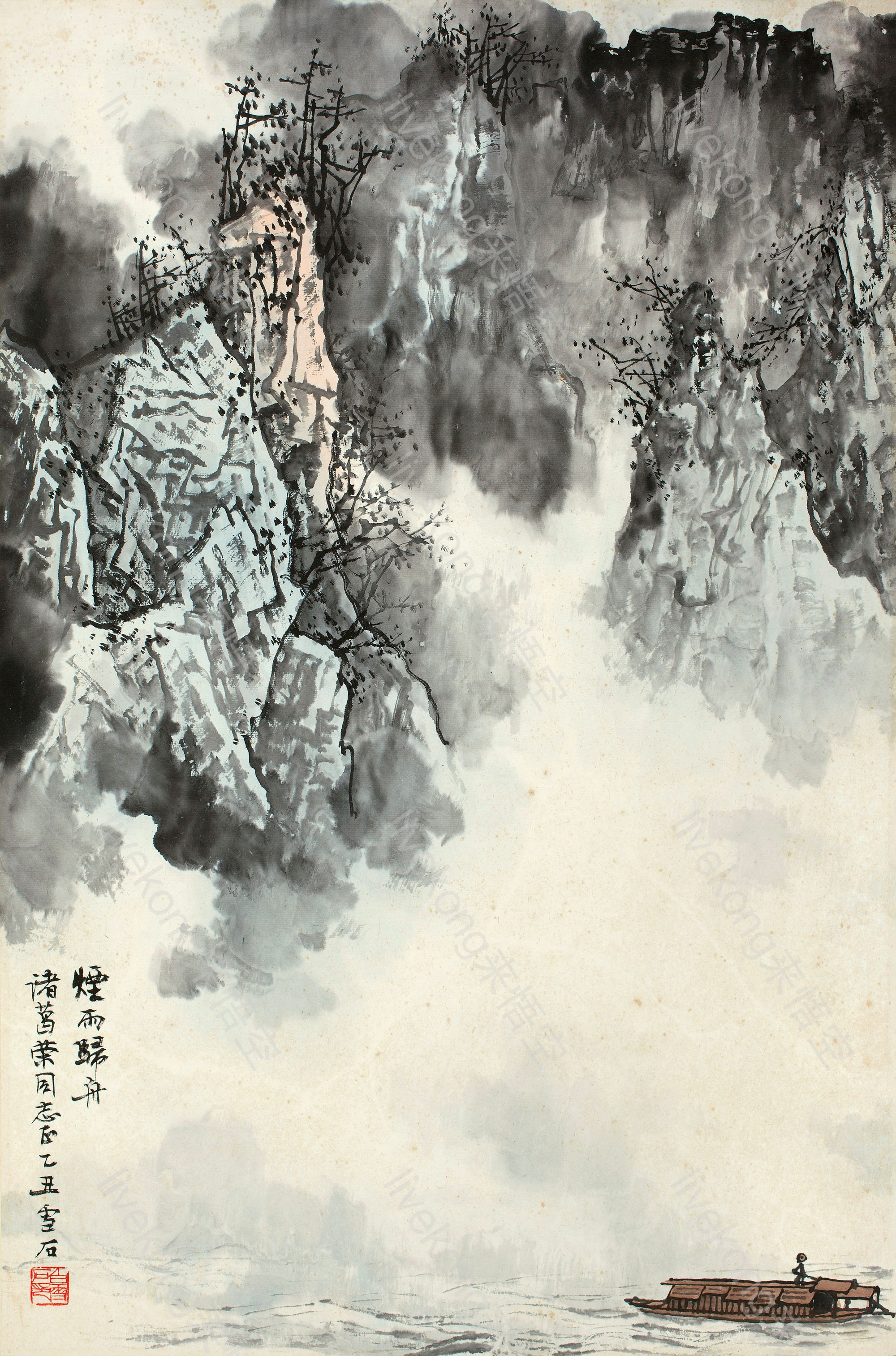 简介:  中国画、国画、山水画、水墨山水、烟雨行舟、白雪石、舟、船只、