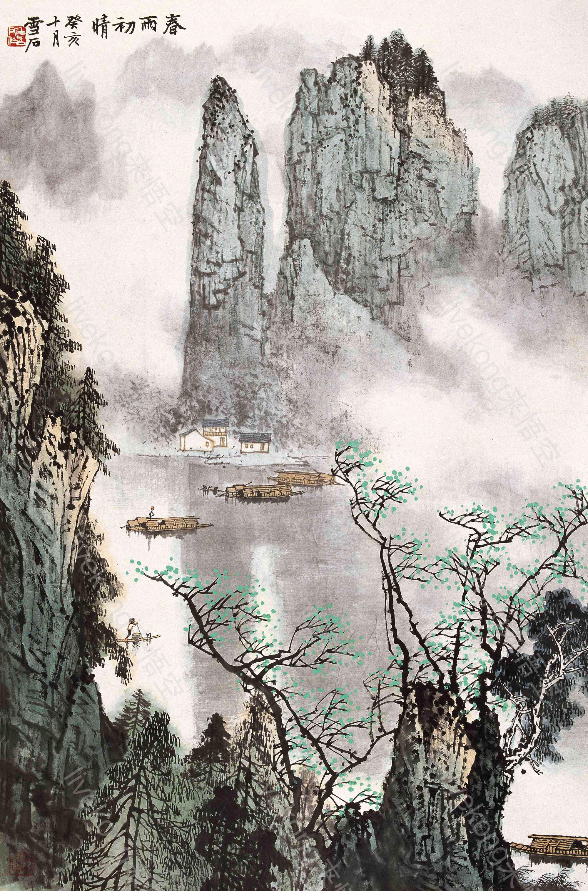 简介:  国画、山水国画、春天、春雨、水墨山水、渔民、青山绿水、