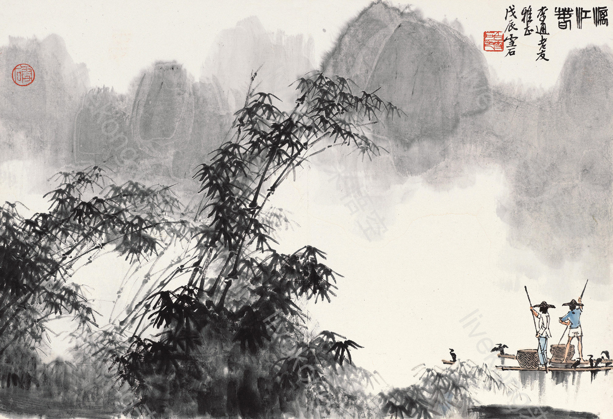 简介:  中国画、名画、国画、山水国画、山水画、桂林山水、水墨山水、渔民、漓江、竹林、船只、鸬鹚、