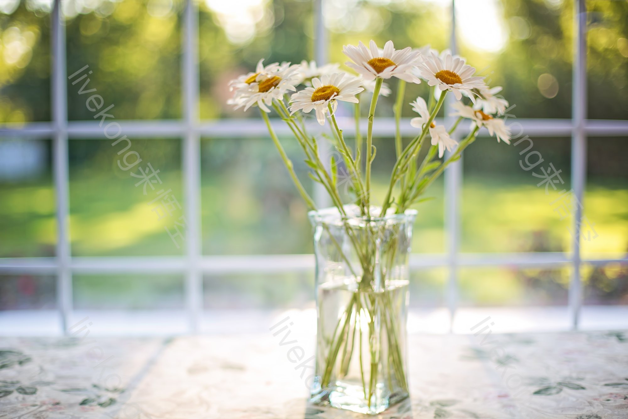 简介:  休闲、夏天、小清新、开花、早晨、浪漫、盛开、窗户、自然、花束、花瓶、阳光、雏菊、