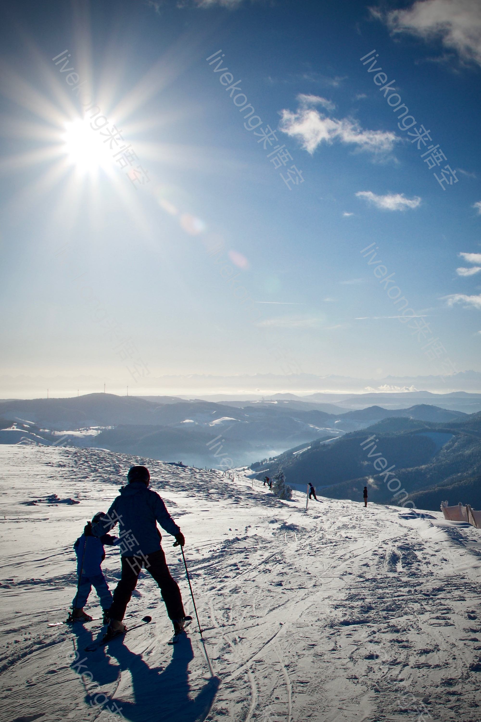 阳光下父子滑雪