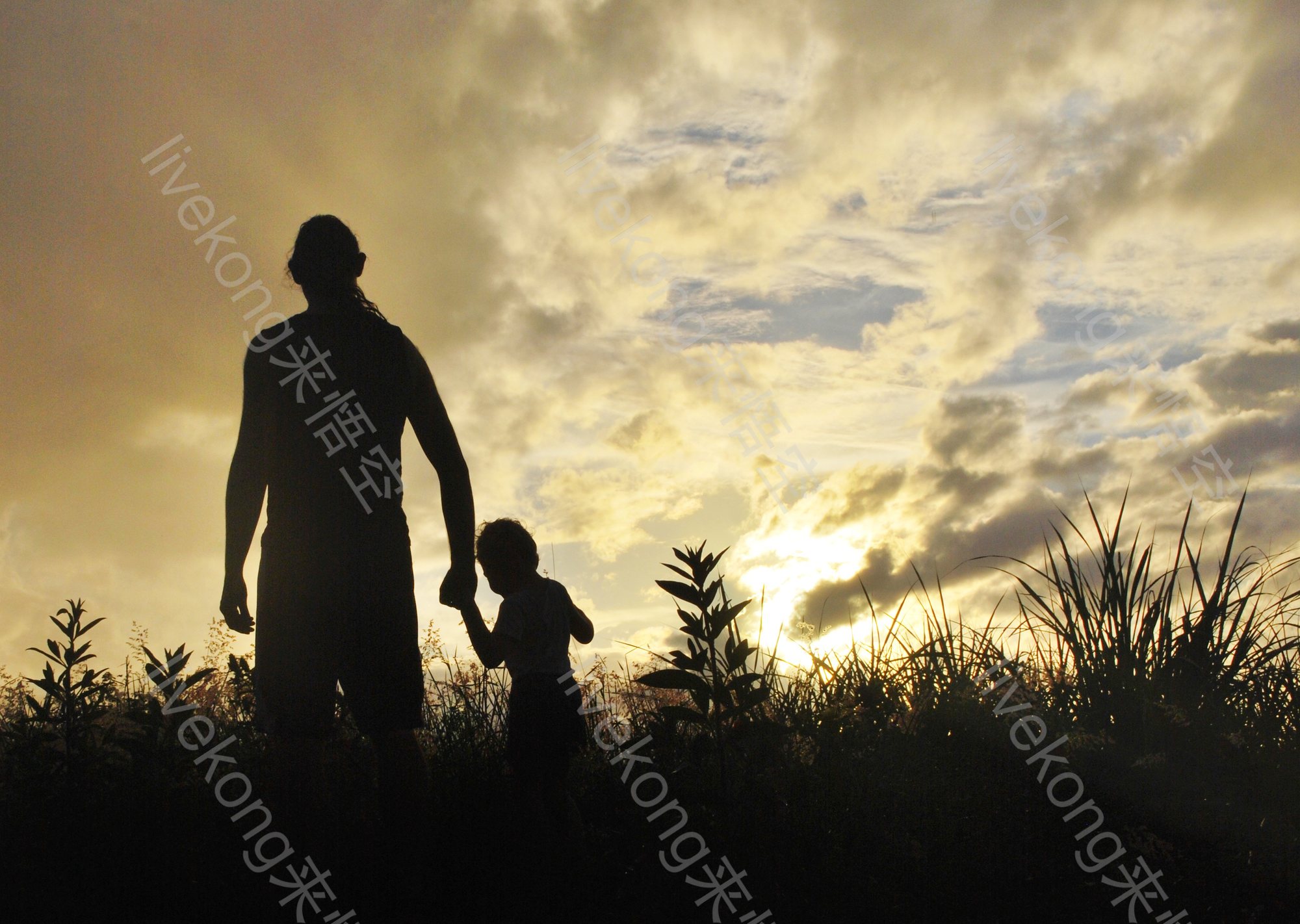 父亲牵着儿子手看风景