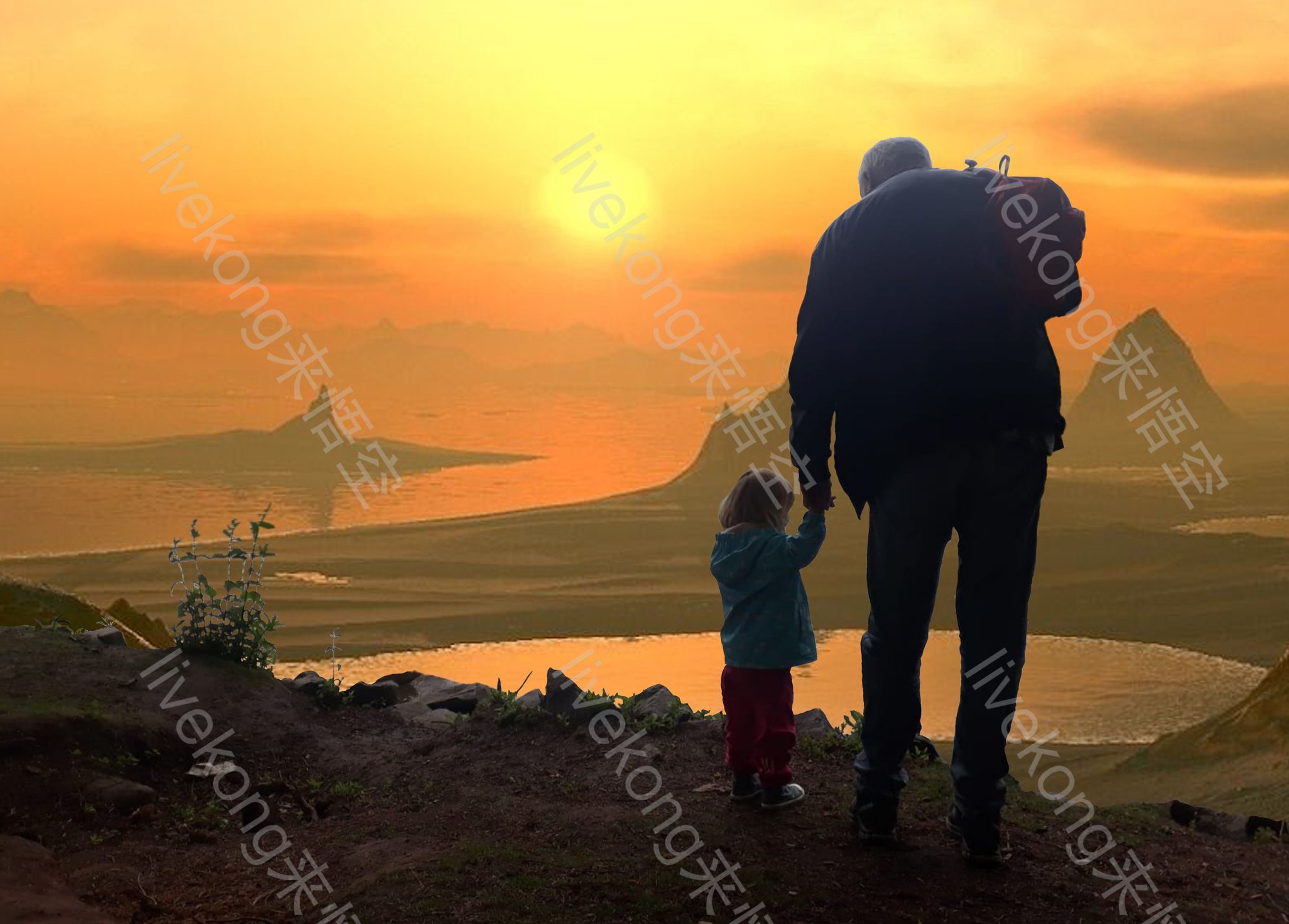 父亲牵着女儿的手看日出