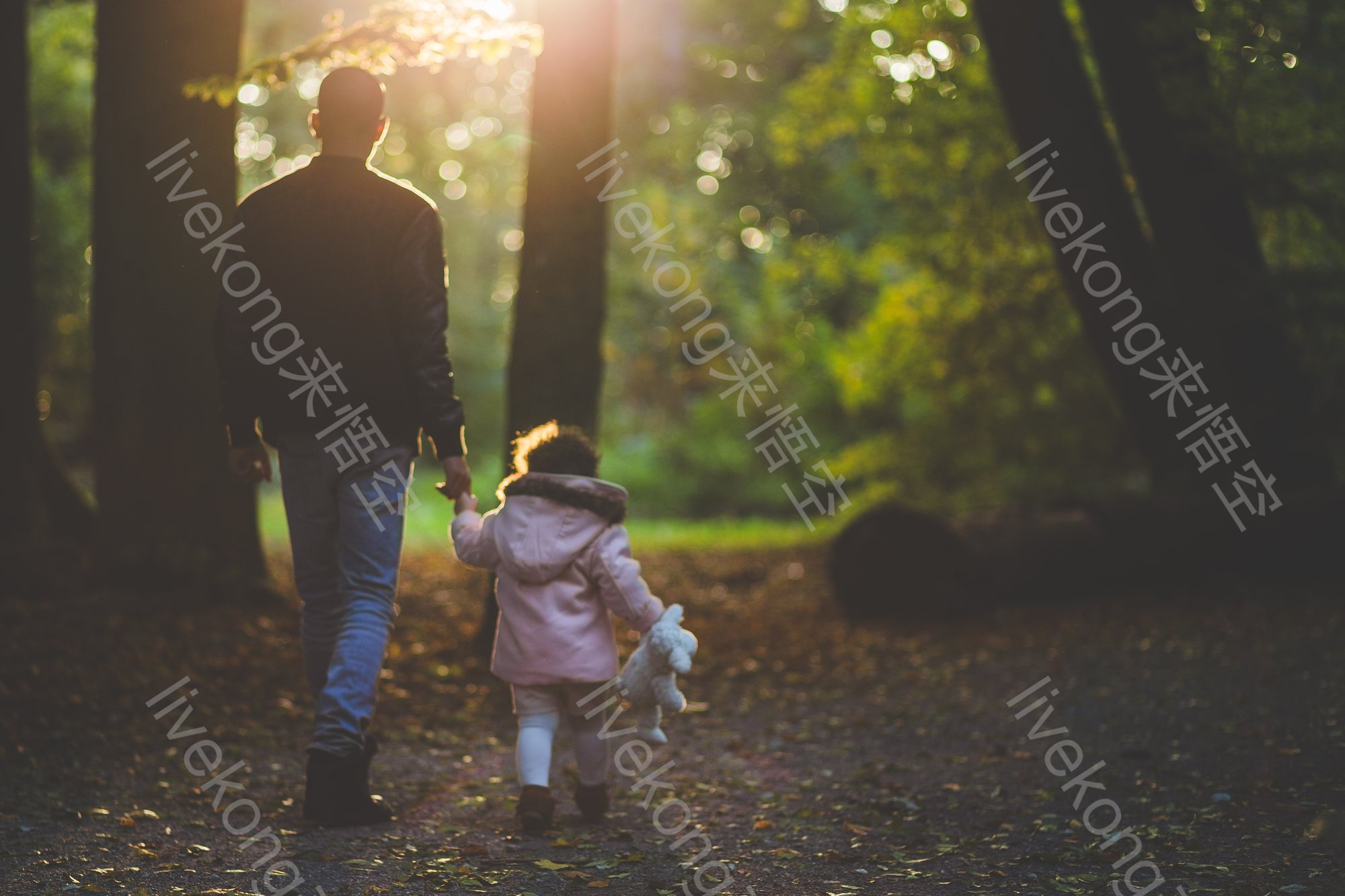 父亲牵着女儿的手在树林里走路