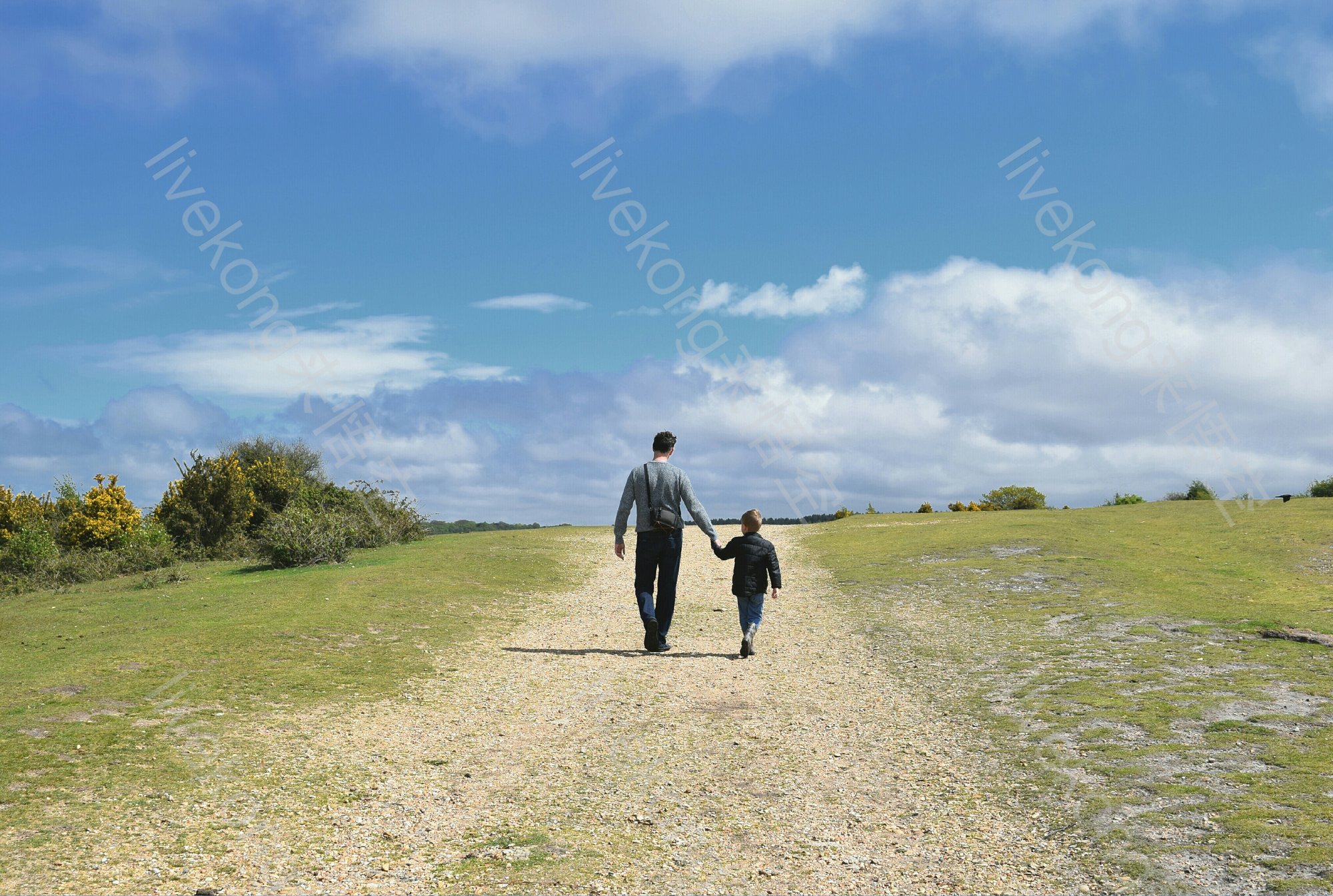 蓝天白云下父子一起在郊外散步