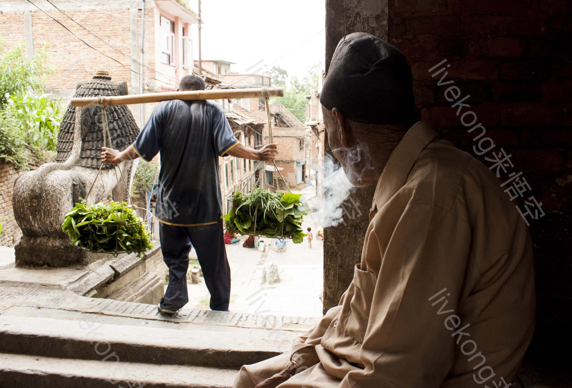 白胡子老人看向门外挑担子卖菜的人