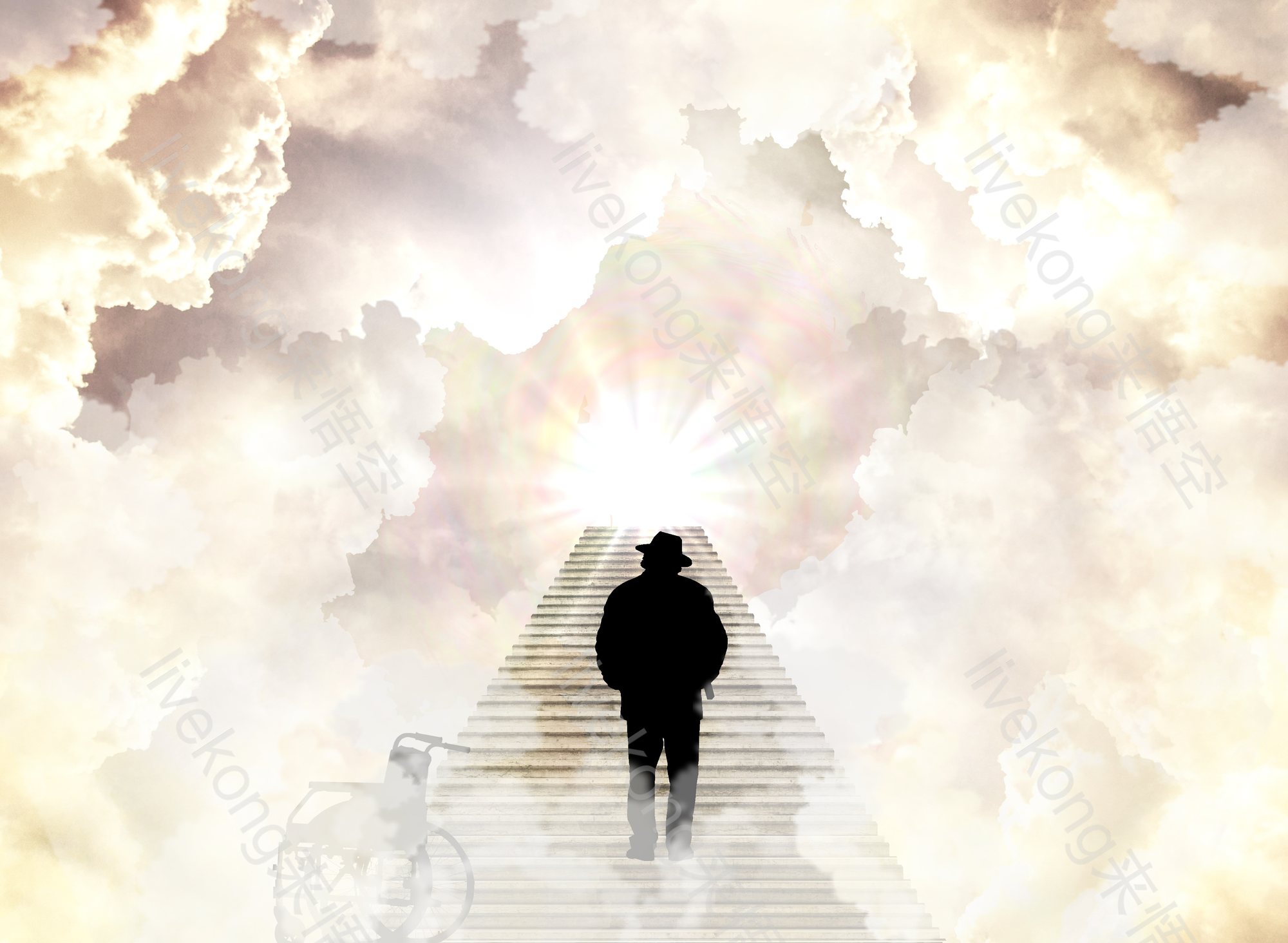 男人走向通往天堂的楼梯