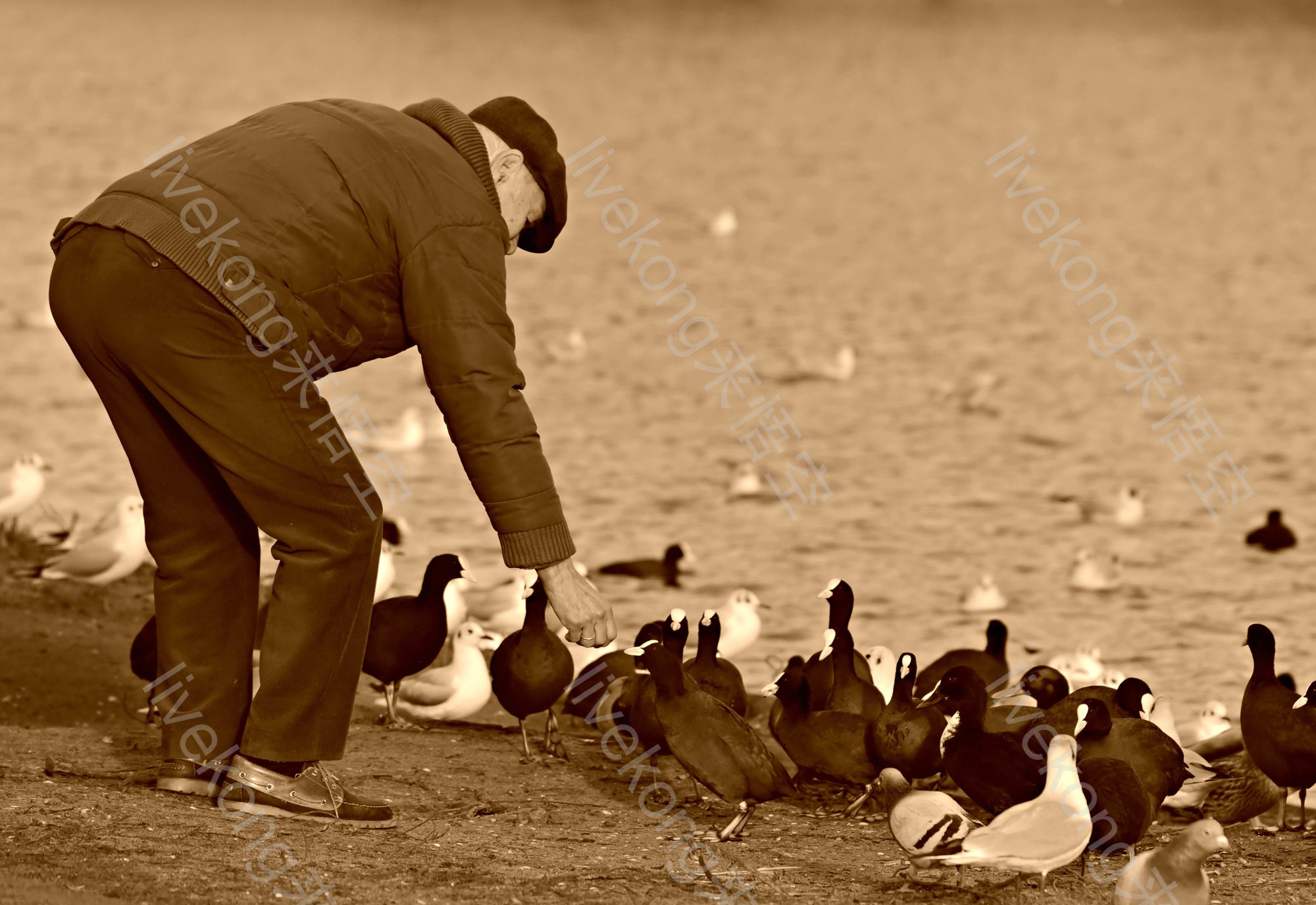 老人在河边喂养鸽子
