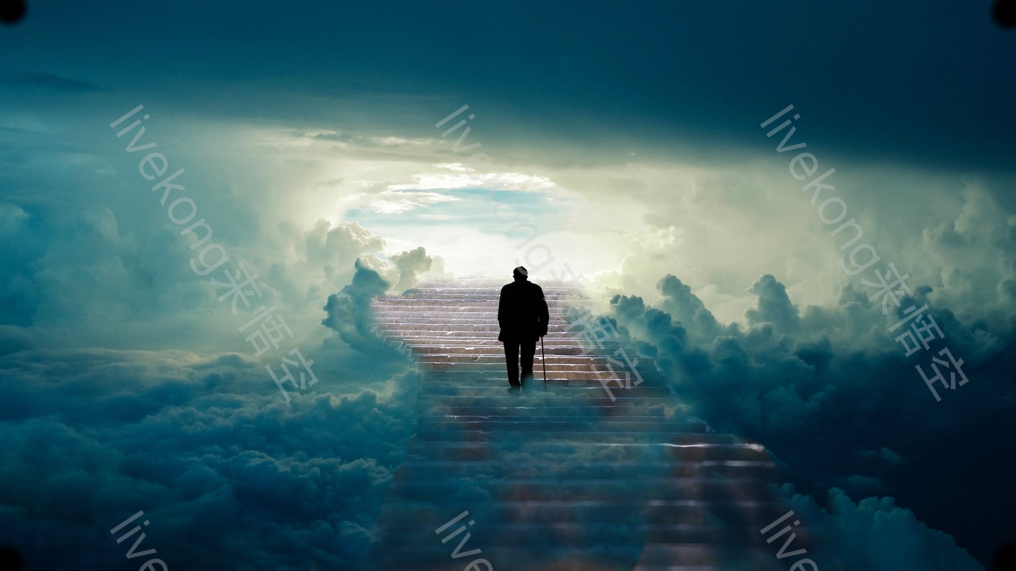 老人拄着拐杖走在楼梯上