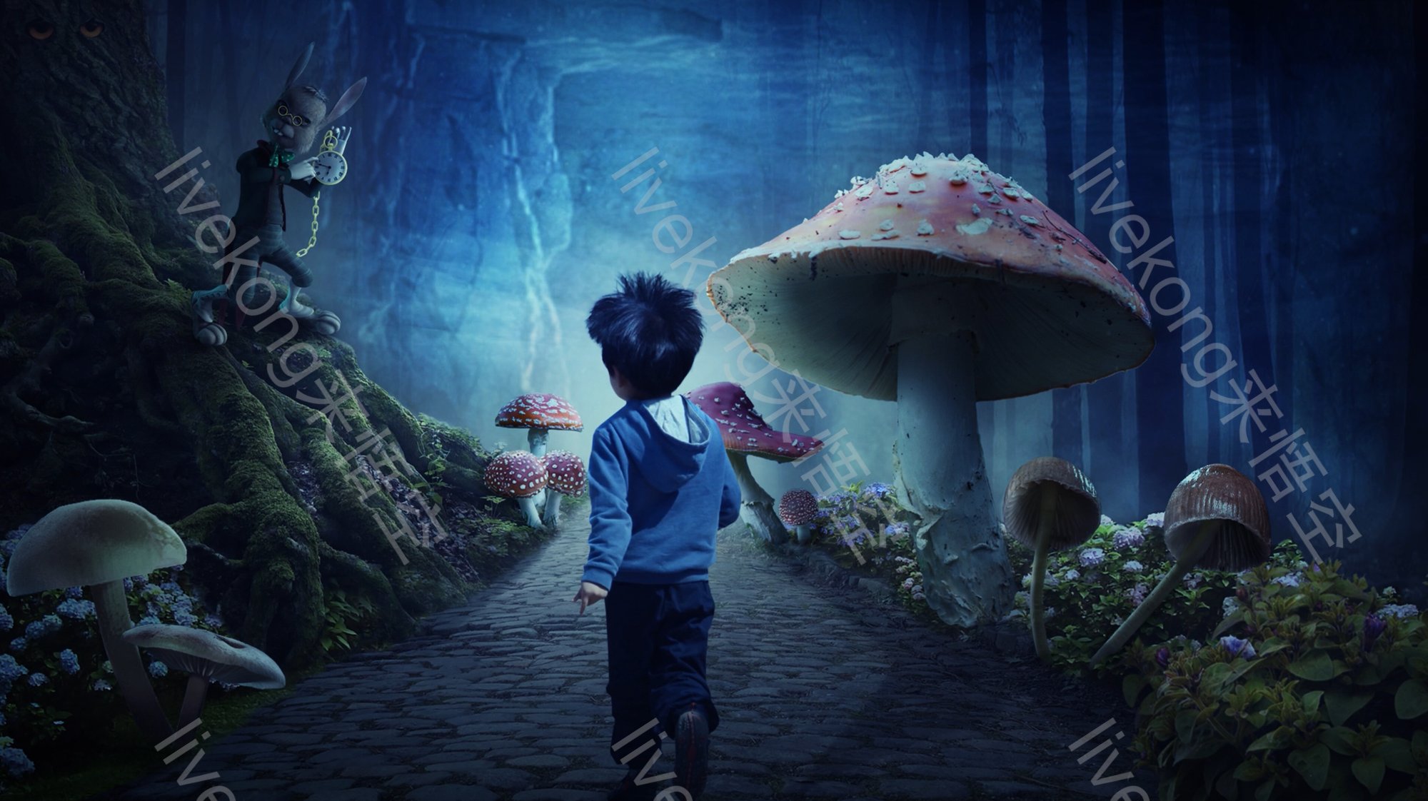 简介:  大树、孩子、开心、快乐、树林、梦境、梦幻森林、森林、童话场景、自然、花草、蘑菇、路、风景、