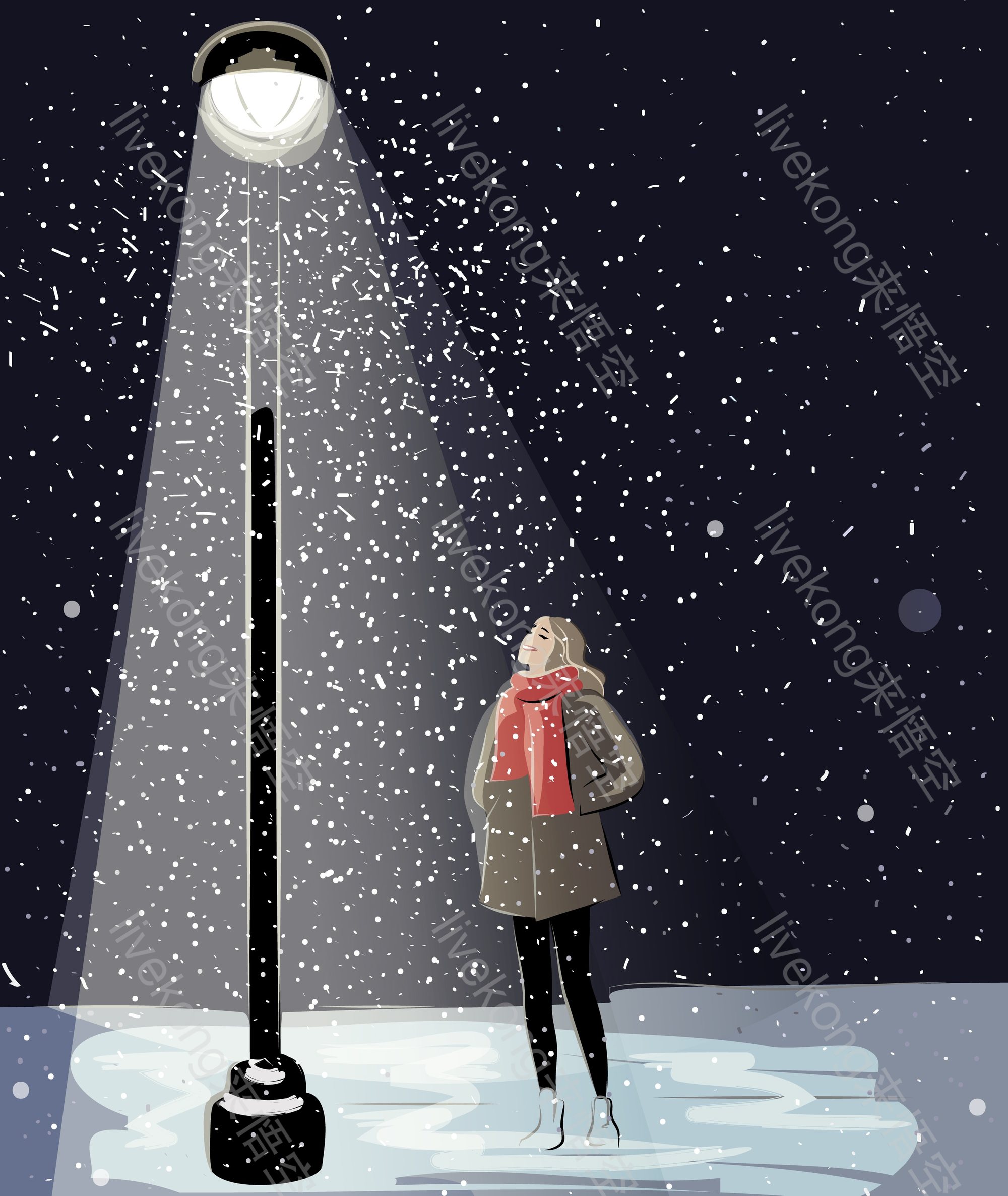 简介:  下雪、人物、冬天、冬季、卡通、夜晚、夜景、女人、手绘、插画、绘画、美女、艺术、路灯、雪地、雪景、