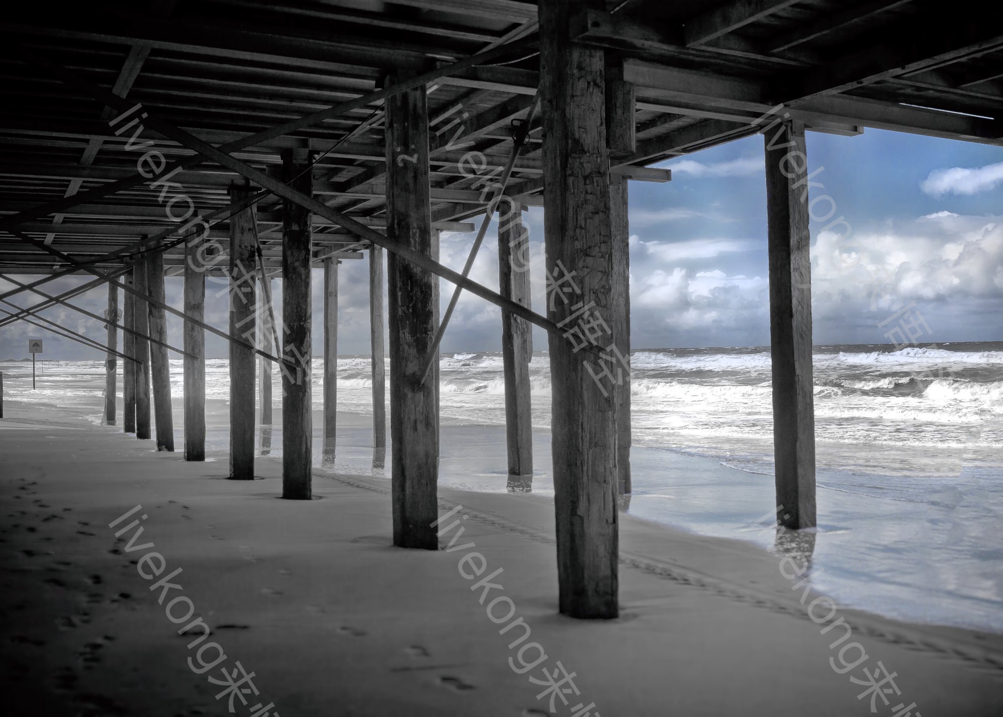 简介:  复古、建筑、木桩、桥、沙滩、浪花、海浪、海滩、海边、白云、自然、蓝天、路、风景、