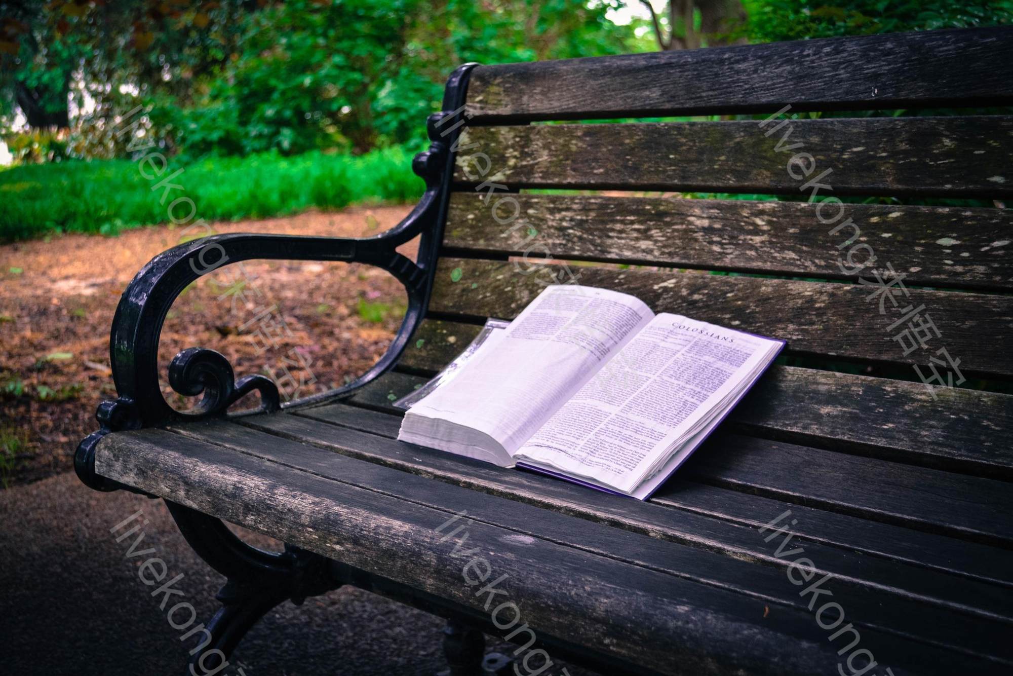 简介:  书、书本、书籍、休闲、公园、复古、春天、看书、长椅、雨后、