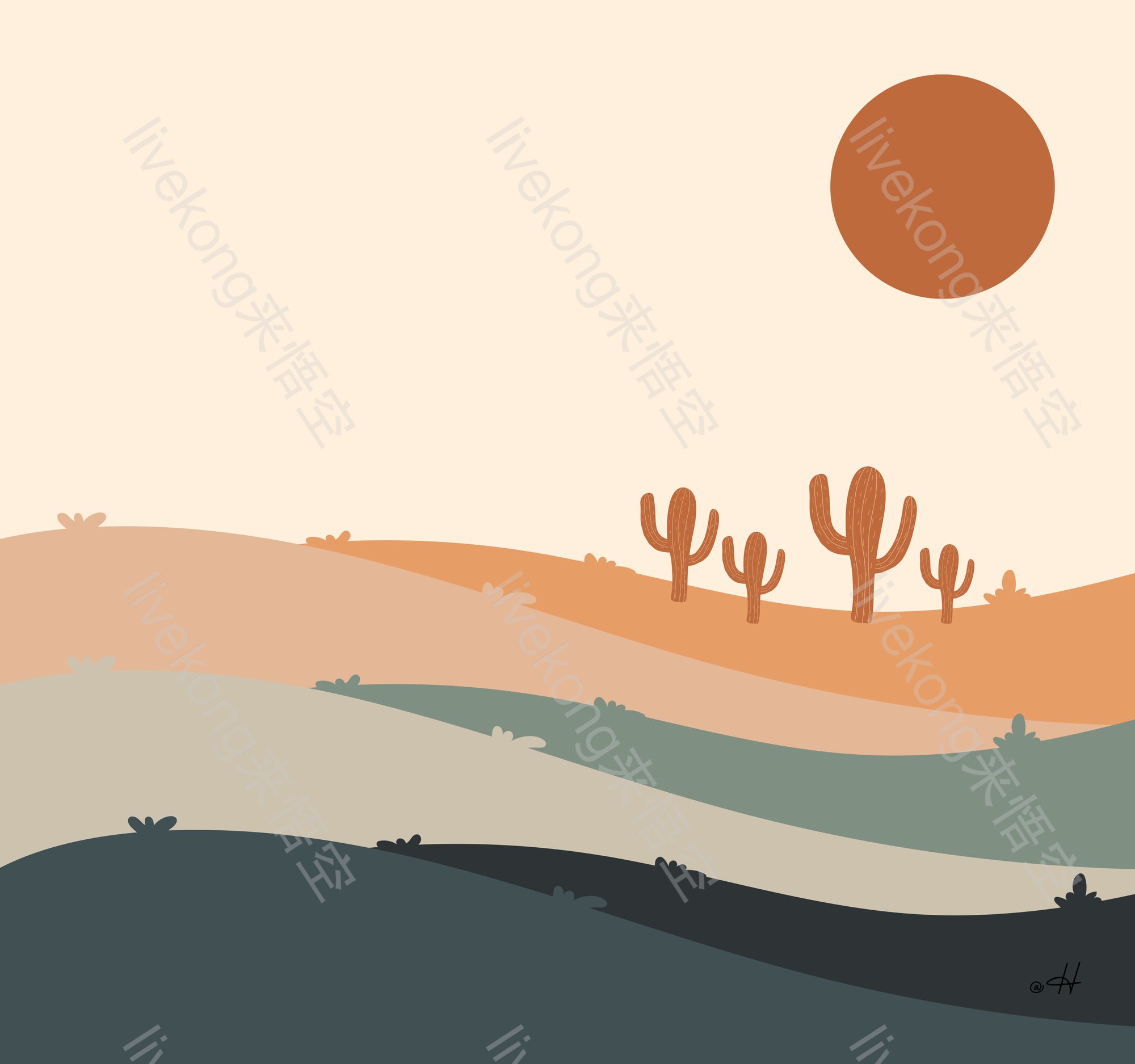 简介:  丘陵、丰富多彩的、仙人掌、创意、创造力、太阳、插画、日落、月亮、