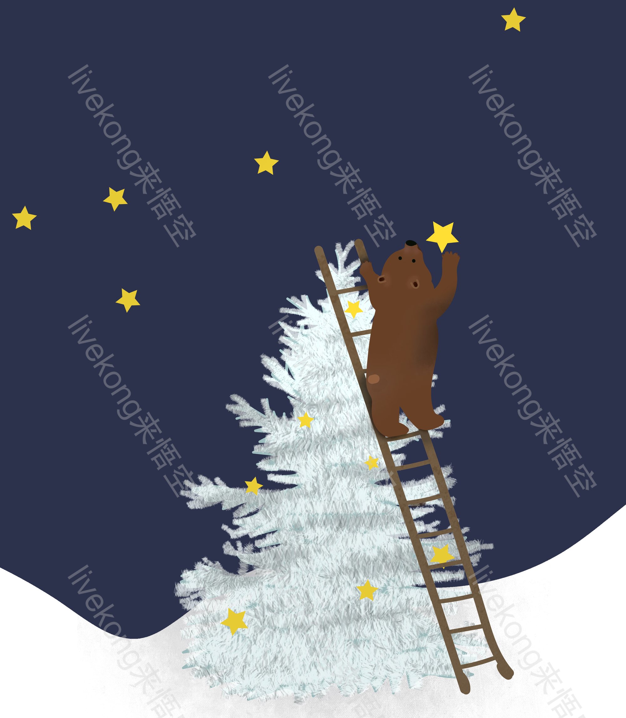 简介:  圣诞夜、圣诞树、圣诞节插画、平安夜、插画、星空、狗熊、雪地、