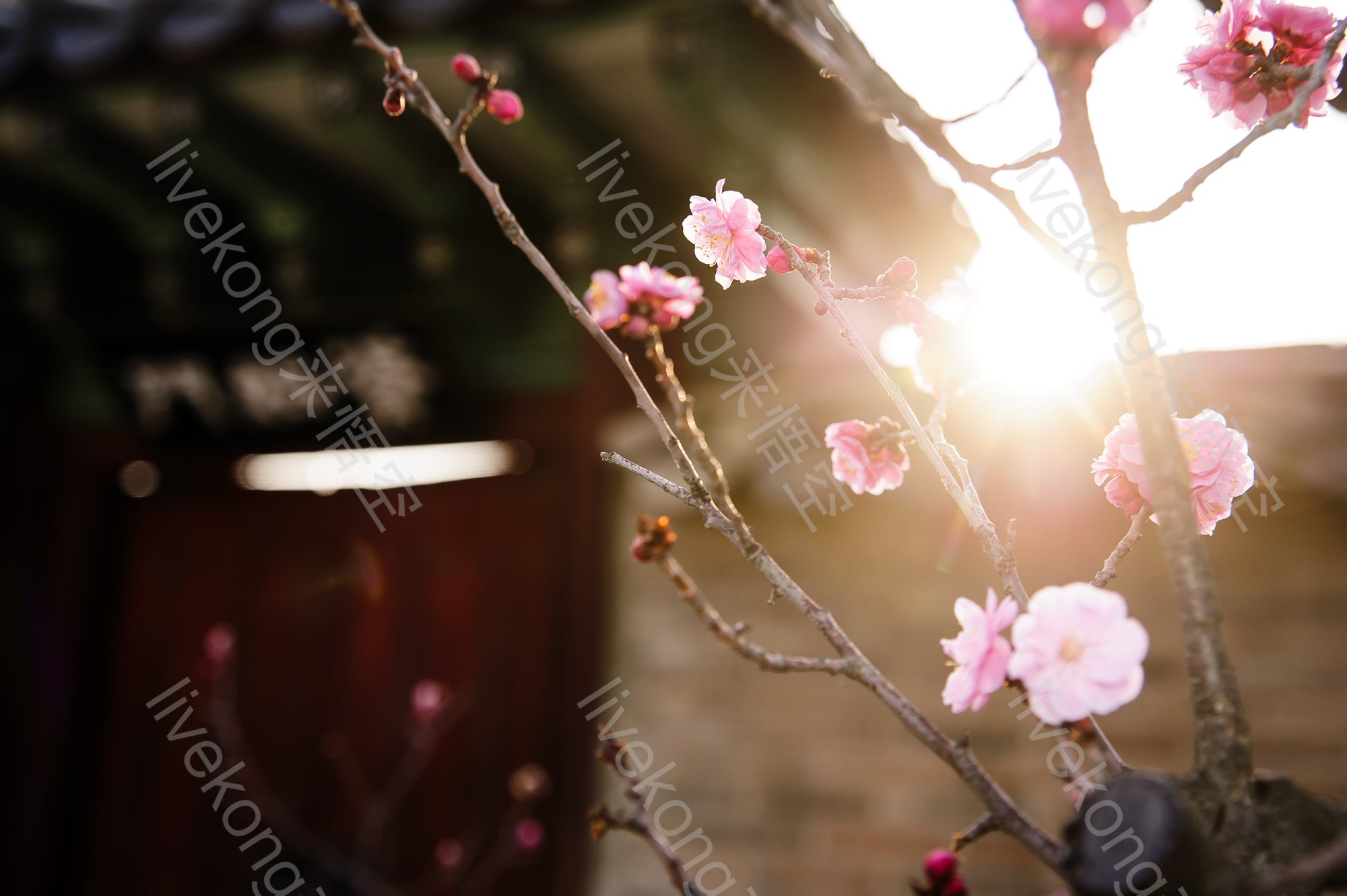 简介:  古建筑、太阳、开花、春天、梅花、植物、樱花、粉色花朵、绽放、花卉、花朵、阳光、