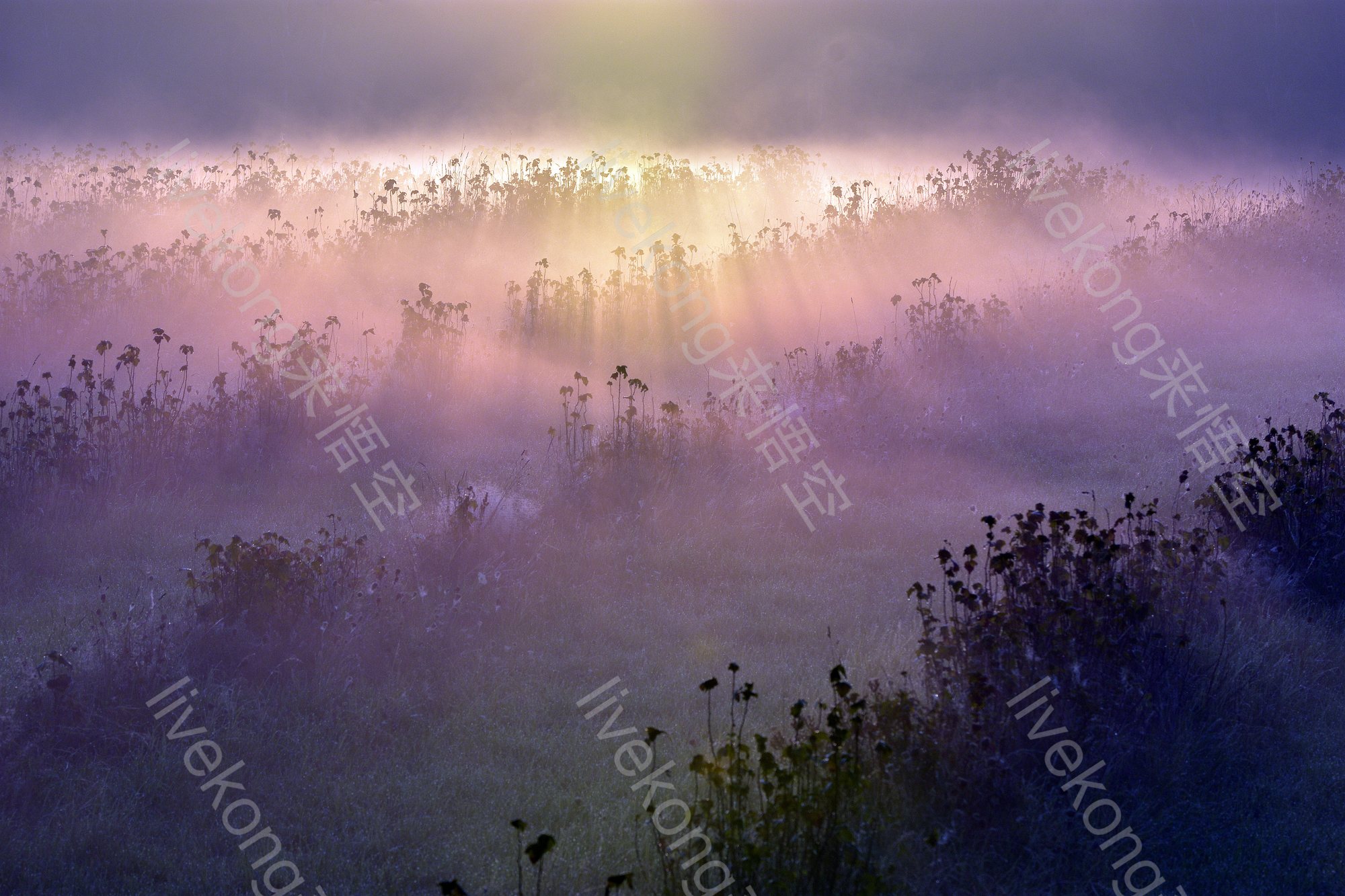 晨雾下野花草地